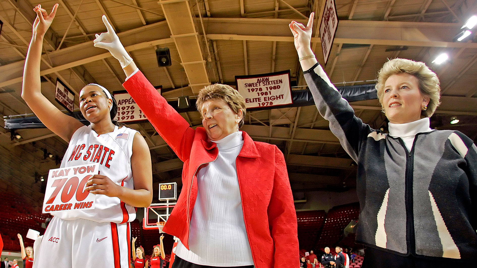 Photo: Coach Kay Yow (center) with Stephanie Glance (right) as the North Carolina State women’s basketball team celebrates 700 wins in 2007. Courtesy of North Carolina State University.